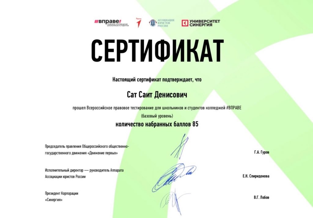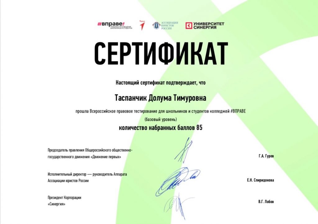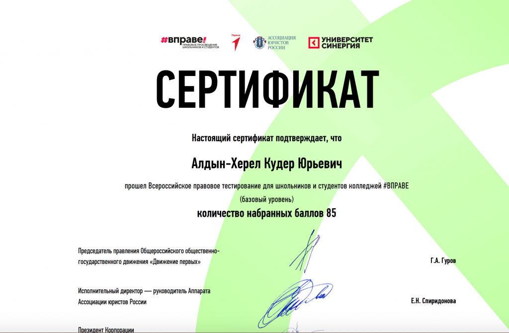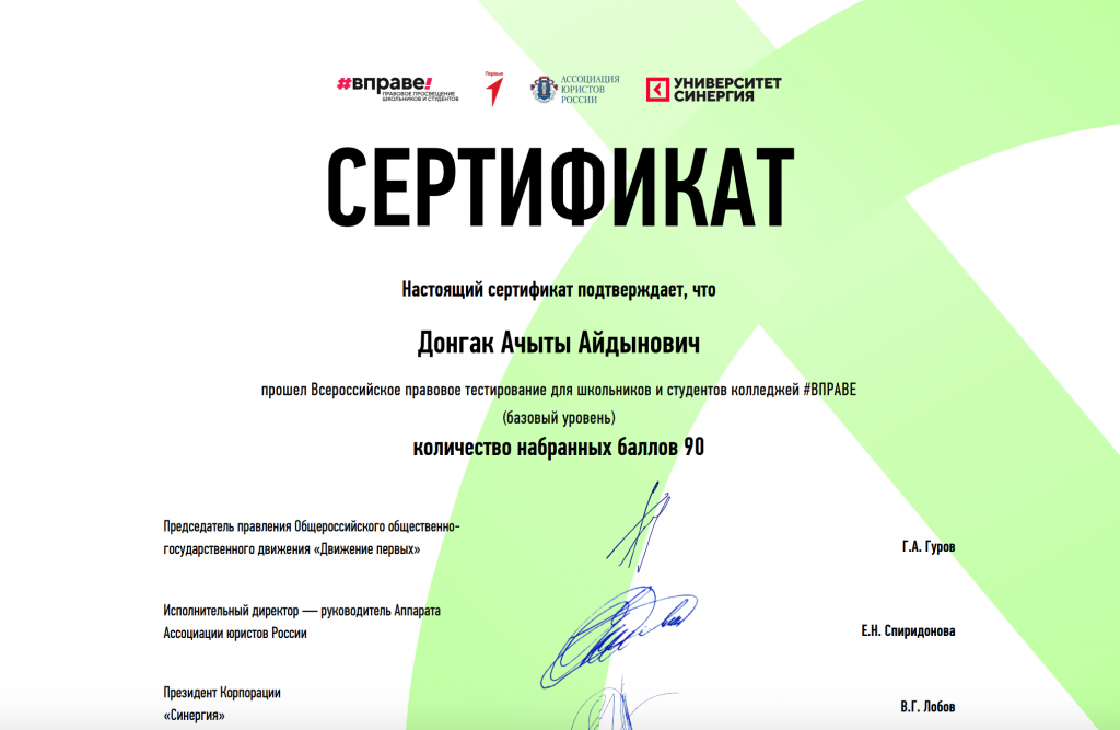 Без рубрики Всероссийское правовое тестирование#ВПРАВЕ 18.11.2024 / Знание основ права — это важно! Это подтвердили наши активисты из Движения Первых!Ребята под руководством Пиче-оол Саиды Хандыгаевны успешно прошли Всероссийское правовое тестирование и показали отличные результаты!