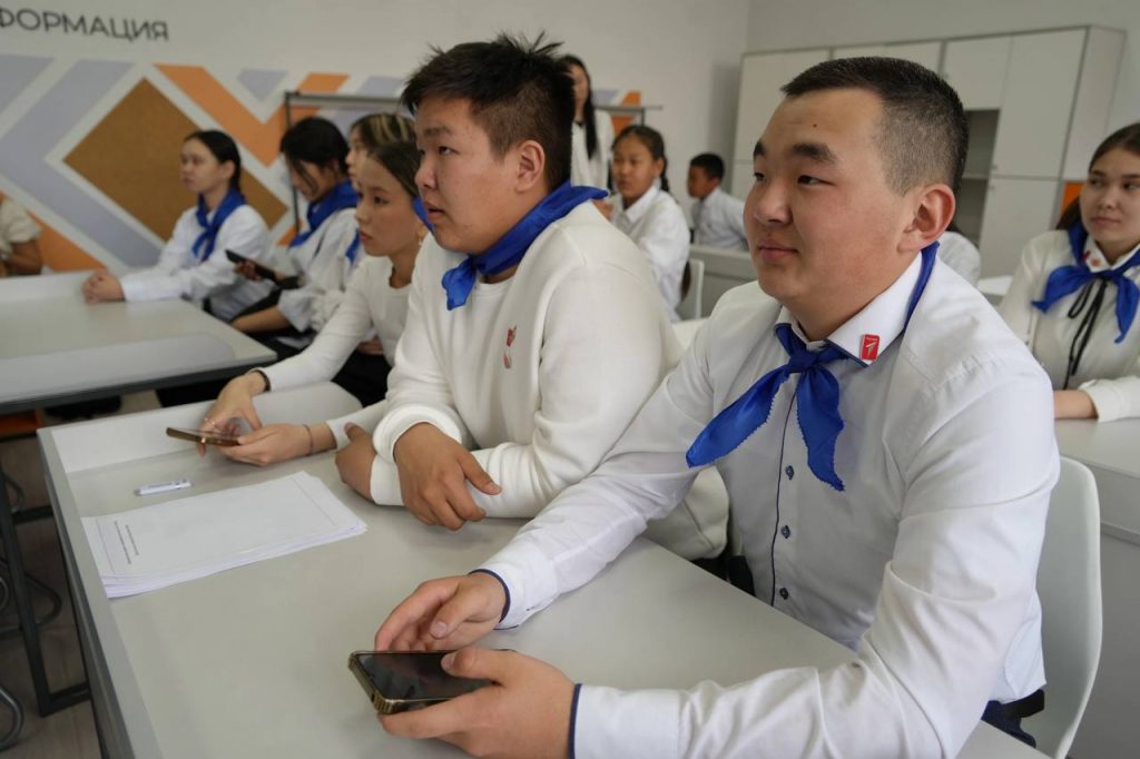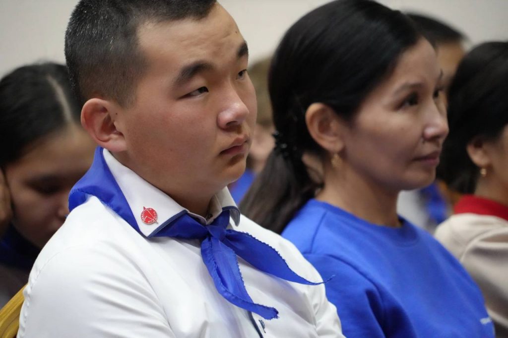 В торжественной обстановке перед школьниками выступил участник СВО, ветеран МВД, майор в отставке, журналист Сайгын Бюрбю. Он рассказал о доблести, бесстрашии и героизме российских бойцов, патриотизме.