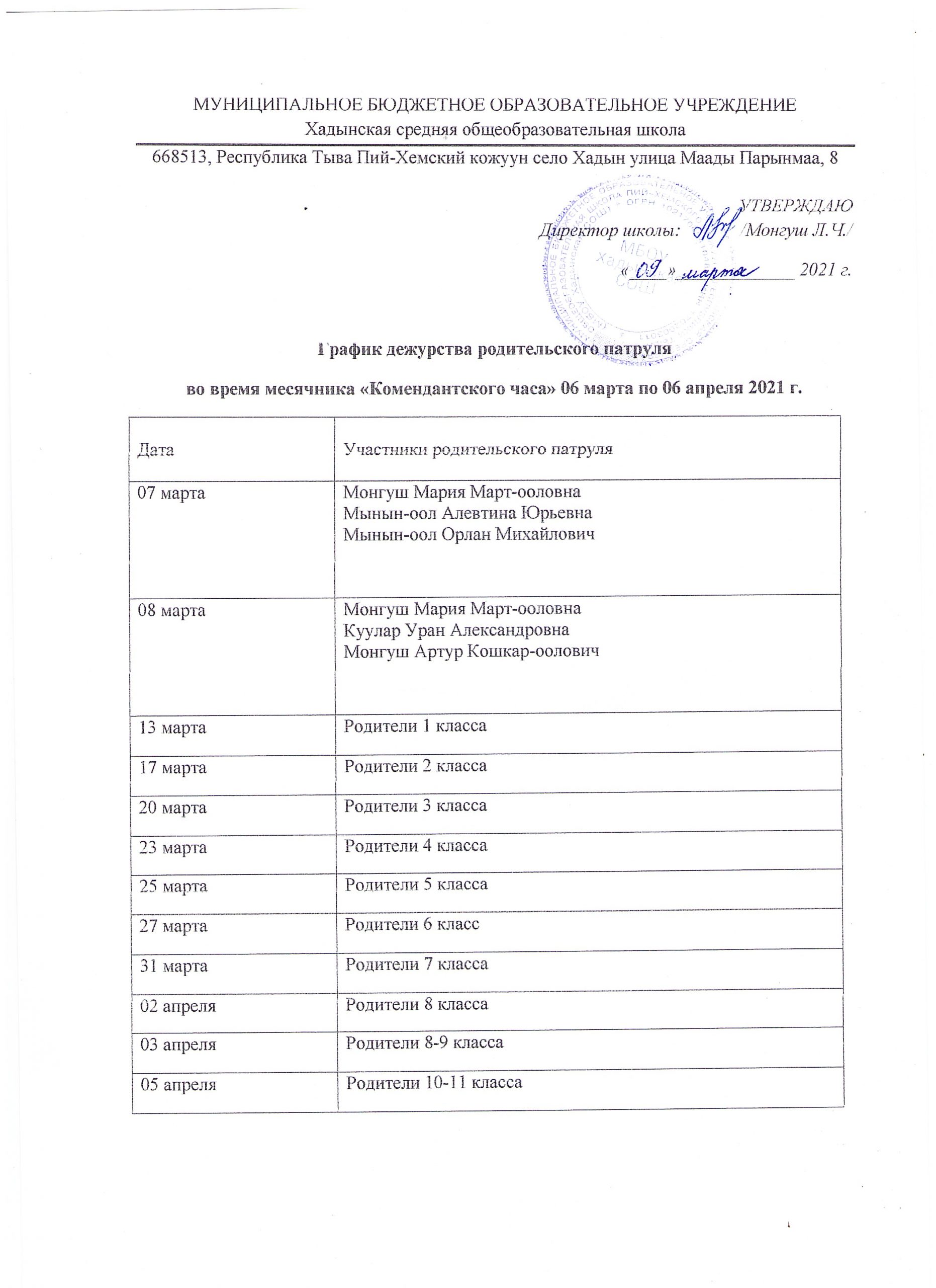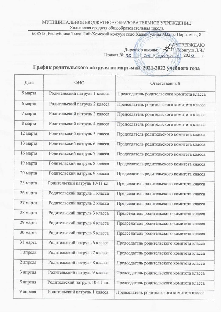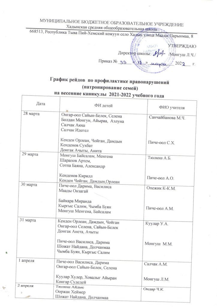График рейдов по профилактике правонарушений на весенние каникулы 2021-2022 уч. года